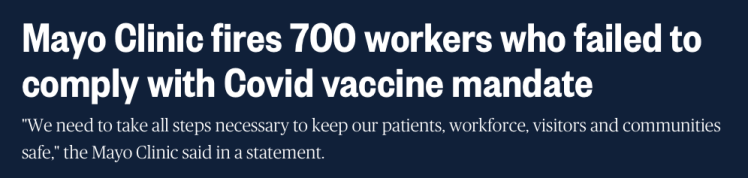 A los Médicos expulsados ​​de sus Hospitales les resulta difícil encontrar personal de otros Hospitales para unirse, ya que también pueden ser propiedad del mismo Gigante Corporativo. Como resultado, las políticas obligatorias de vacunación incluyen un número mucho mayor de empleados de Hospitales. Por ejemplo, Mayo Clinic despidió a 700 empleados por ejercer su derecho a rechazar una vacuna experimental peligrosa, esencialmente no probada.[51 ,